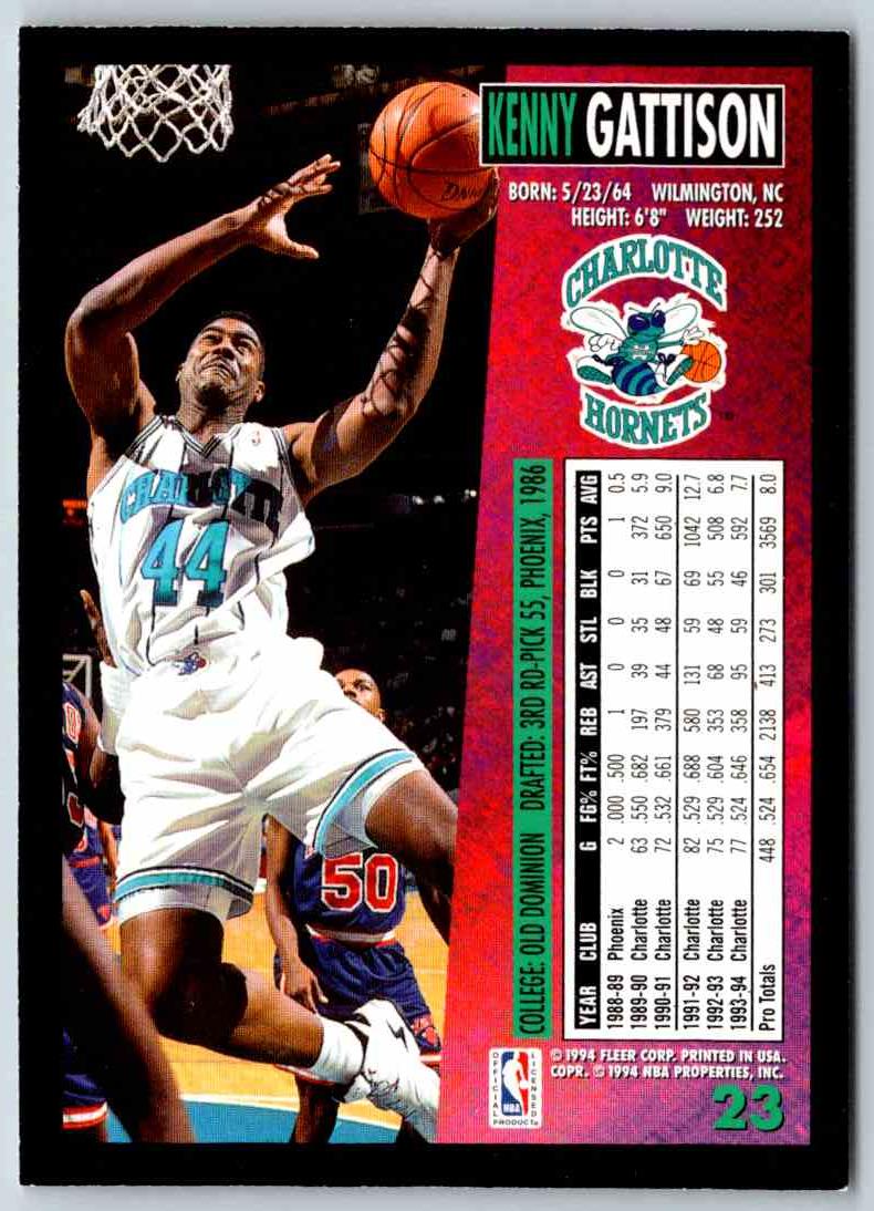 This 1992 Fleer Kenny Gattison #23 card is a must-have for any basketball fan! Featuring the former Charlotte Hornets player in a bright yellow jersey, this card will easily stand out in any collection. The card is in great condition and features a high-resolution image of Gattison, capturing all the details of his signature style. With a detailed design on the back, this card is a great piece of memorabilia to add to your collection or to give as a gift to the basketball aficionado in your life. Get your hands on this unique card today!