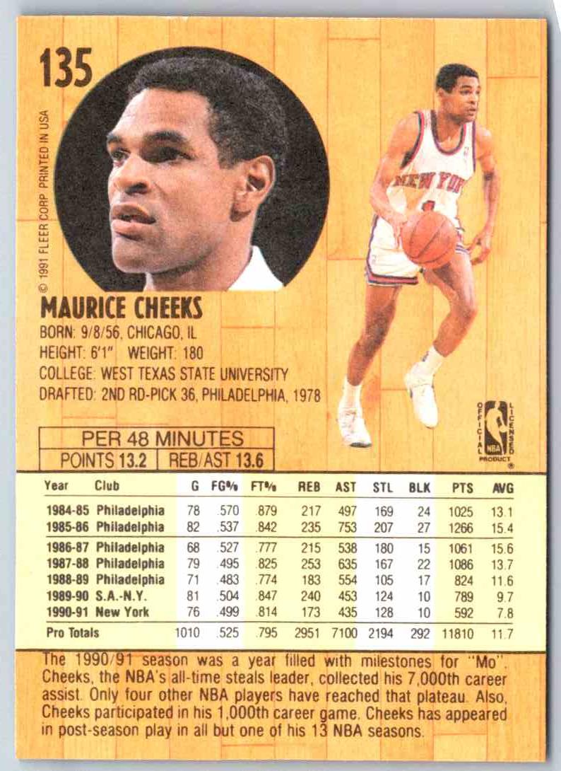 This 1992 Fleer Maurice Cheeks card is a must for any basketball fan or collector! This card features Cheeks in his classic 76ers uniform, ready to make a play. His career highlights are listed on the back, including his four All-Star selections. This card is in great condition, perfect for any collection. Don't miss your chance to add Maurice Cheeks to your collection!
