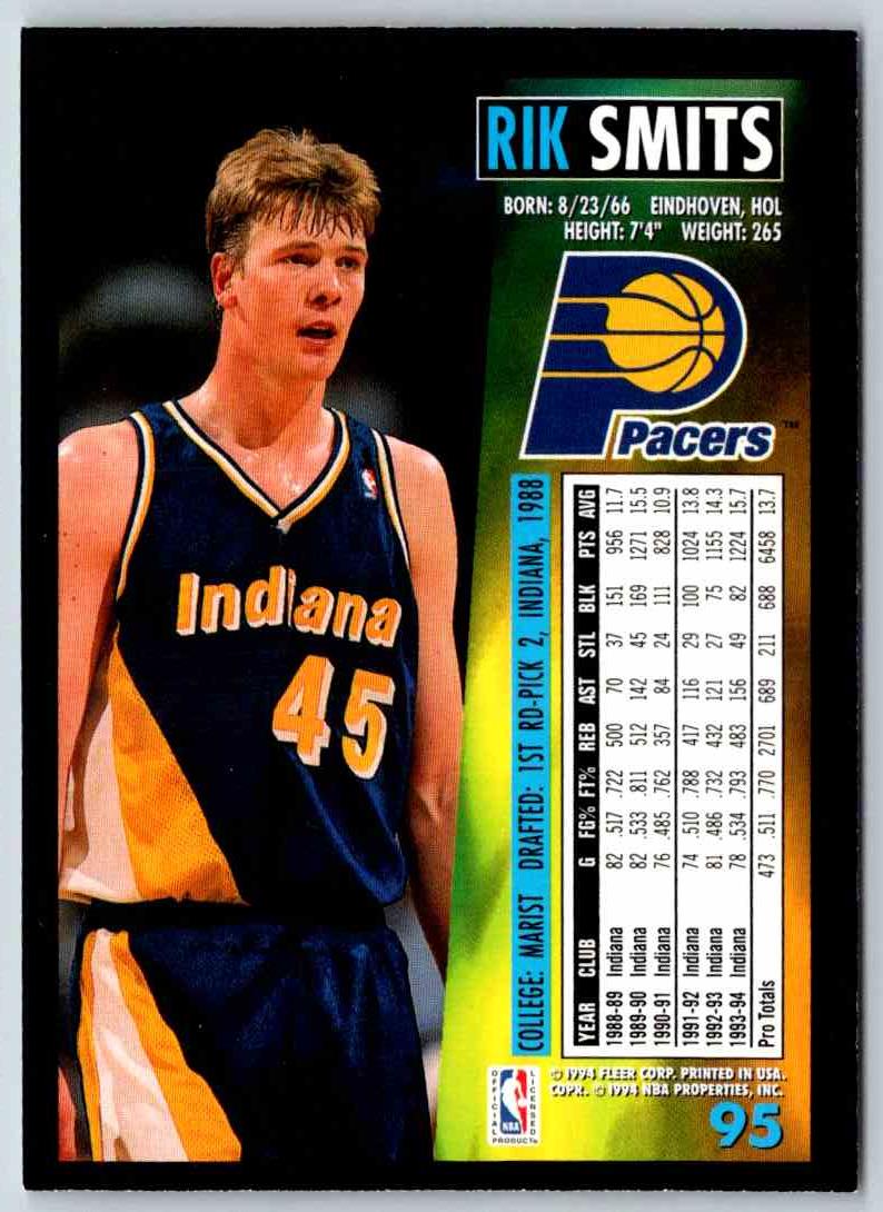 This 1992 Fleer Rik Smits #95 card is a must-have for any serious basketball card collector. Smits was a dominant force in the NBA for over a decade, and his career was filled with numerous accolades, including an All-Star appearance in 1998. This card features a crisp, clear image of Smits in his Indiana Pacers uniform, and the back of the card contains a detailed biography of his career so far. Add this card to your collection today and remember the incredible career of Rik Smits!