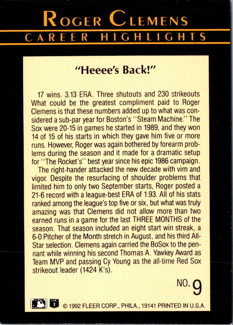 Description: 1992 Fleer Roger Clemens Roger Clemens #9