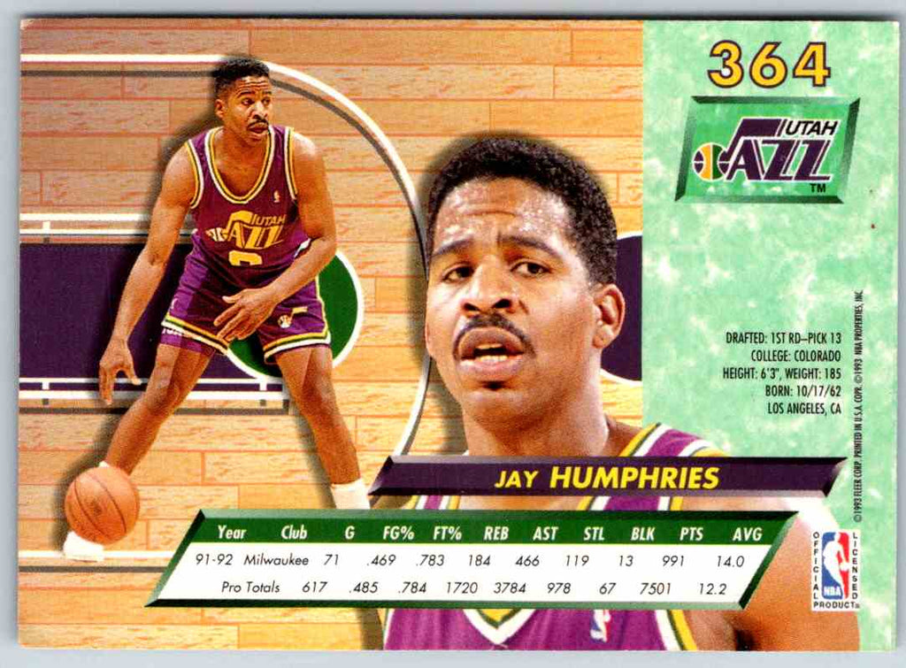This 1992 Fleer Ultra Jay Humphries #364 card is a must-have for any basketball fan! Featuring a full-color action shot of the 6-time NBA All-Star, this card is sure to be a conversation starter in any collection. Humphries' career highlights include six All-Star appearances, a two-time All-NBA selection, and a selection to the NBA All-Defensive Second Team. This card celebrates the accomplishments of one of the NBA's greatest players and is sure to be a treasured addition to any basketball card collection.