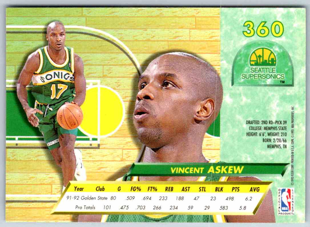 This 1992 Fleer Ultra Vincent Askew #360 card is a must-have for any sports memorabilia collector. Featuring vibrant colors and detailed artwork of the former NBA star, this card is sure to be a standout in any collection. With its unique design, this card celebrates the career of the former Phoenix Suns player, capturing his essence and impact on the game. Get your hands on this classic card and relive the glory of Vincent Askew's NBA career.