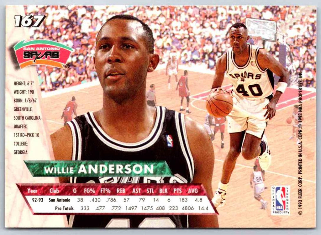 This 1992 Fleer Ultra Willie Anderson #167 card is a must-have for any basketball fan or card collector! Showcasing a crisp, clear image of Anderson in action, this card is sure to bring any collection to life. The card is in near-mint condition and features detailed action stats and highlights from the 1991-1992 season. Add this card to your collection today and commemorate the legendary career of one of the most exciting players in the game!