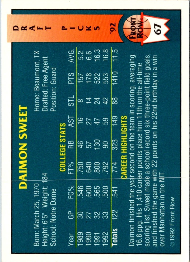 Description: 1992 Front Row Draft Picks Daimon Sweet #67