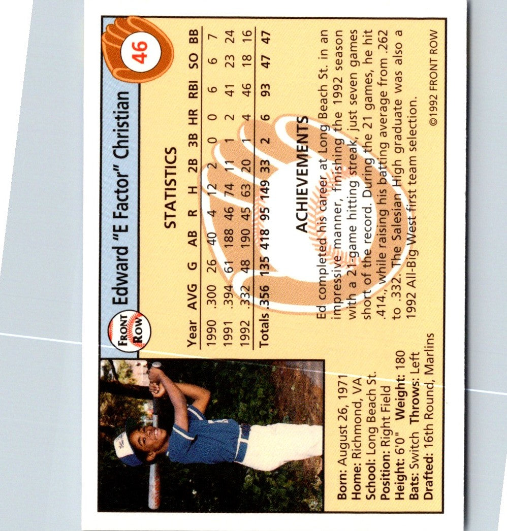 This 1992 Front Row Draft Picks Ed Christian #46 Florida Marlins card is a great collectible for any Miami Marlins fan. Featuring a bright and vibrant design, this card captures Ed Christian in his classic batting stance, ensuring that it will look great in any collection. With its bold colors and sharp details, this card is a must-have for any fan. Whether you display it in your home or keep it in your collection, this card is sure to be a conversation starter. Grab your Ed Christian #46 card today and add a piece of history to your collection.