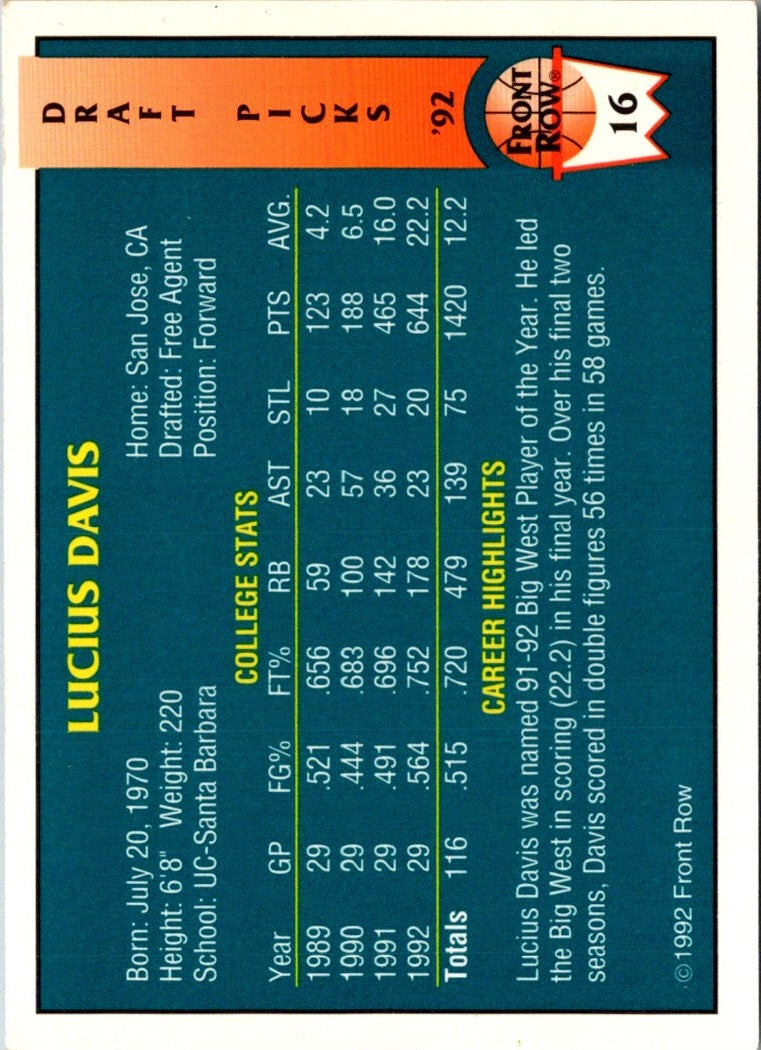 Description: 1992 Front Row Draft Picks Gold Lucius Davis #16