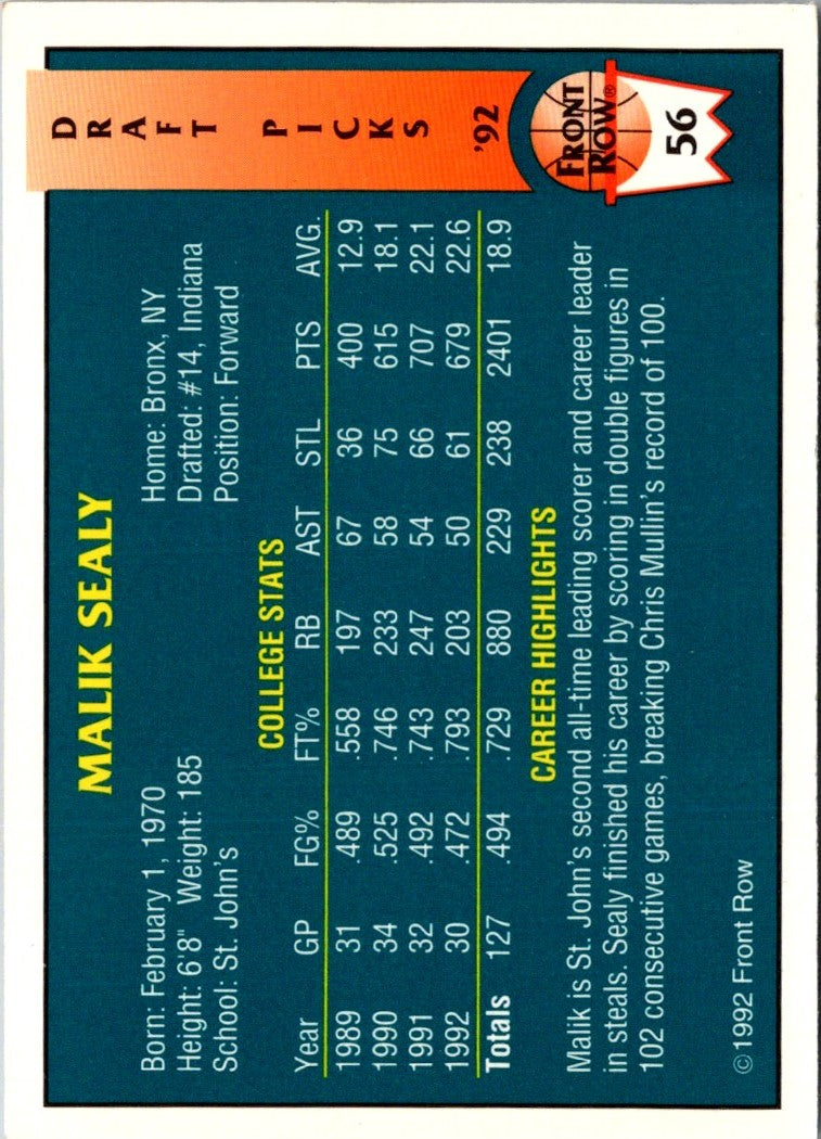 Description: 1992 Front Row Draft Picks Malik Sealy #56