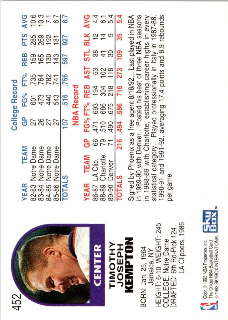 Description: 1992 Hoops Tim Kempton #452