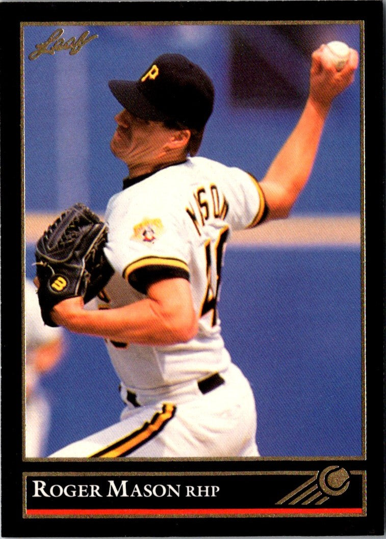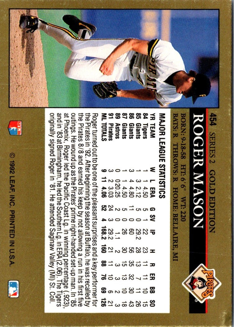 This 1992 Leaf Black Gold Roger Mason #454 Pittsburgh Pirates card features a sharp image of the former Pirates infielder in full fielding motion. It's a great addition to any baseball card collection, and a must-have for any fan of the Pirates. Featuring a glossy black and gold finish, this card is sure to be a conversation piece. A great way to celebrate the history of the Pirates and the career of Roger Mason.