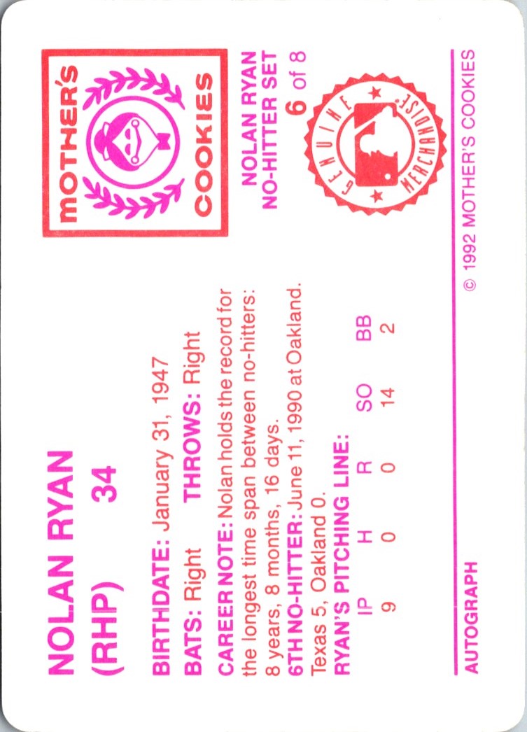 Description: 1992 Mother's Cookies Nolan Ryan 7 No-Hitters Nolan Ryan #6