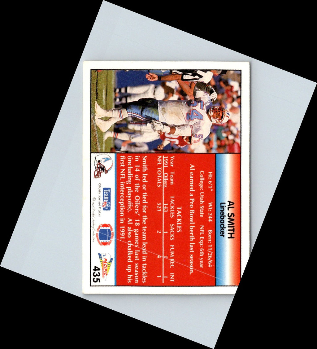 This 1992 Pacific Al Smith #435Houston Oilers card is a must have for any collector! Featuring a full-color portrait of Al Smith in his Oilers uniform, this card is perfect for any sports fan. The vibrant colors and crisp details make it stand out from the rest. It also features a detailed back with information about Al Smith and his career. This card is sure to be an essential part of any sports card collection. Add this card to your collection today and show your support for the Houston Oilers!