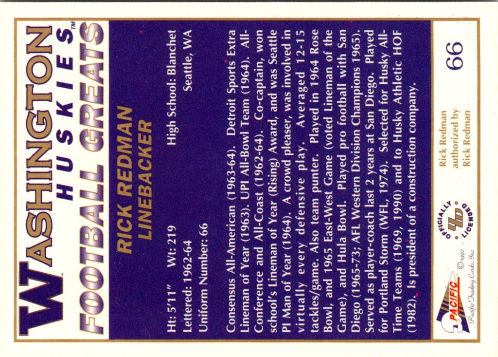 Description: 1992 Pacific Greats Washington Huskies Rick Redman #66