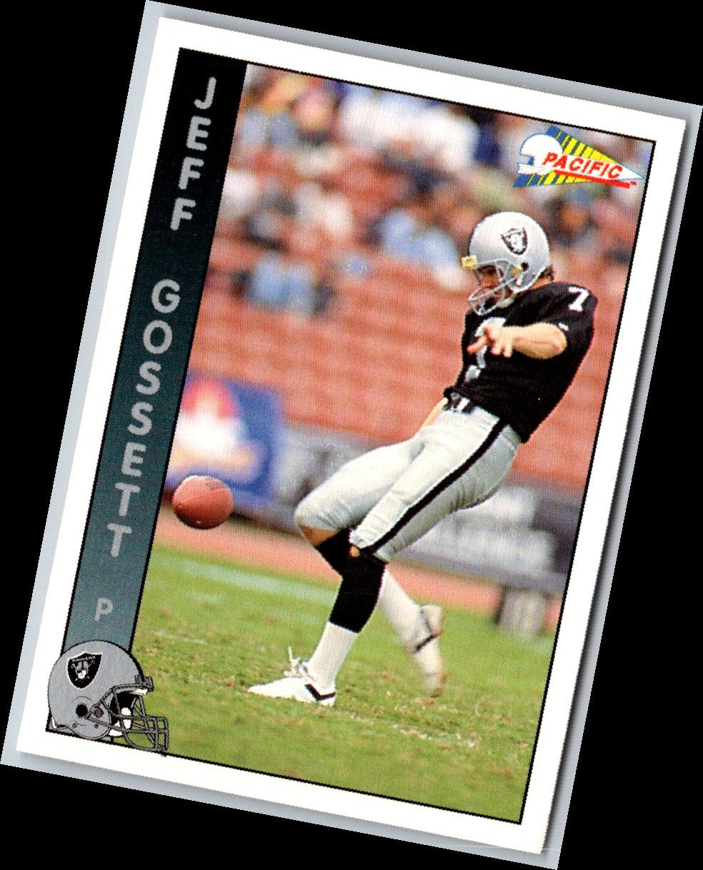 This 1992 Pacific Jeff Gossett #148 Los Angeles Raiders card is a must-have for any Raiders fan! Featuring the Hall of Fame punter and two-time Super Bowl Champion in his signature Raiders jersey, this card will make a great addition to any collection. The card is in near mint condition and features sharp, detailed images of Gossett in action. With crisp and vibrant colors, this card is sure to stand out in any collection. Get your hands on this card and honor Jeff Gossett's legacy with a piece of Raiders history!