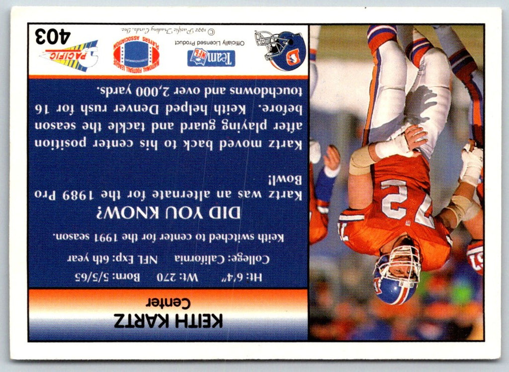 This 1992 Pacific Keith Kartz #403 Denver Broncos card is a must-have for any football fan! Featuring a full-color action shot of Kartz in his signature blue and orange jersey, this card captures the energy of the game in vibrant detail. Printed on sturdy cardstock, this card is sure to stand the test of time. The perfect addition to any collection, don't miss out on this classic football card!