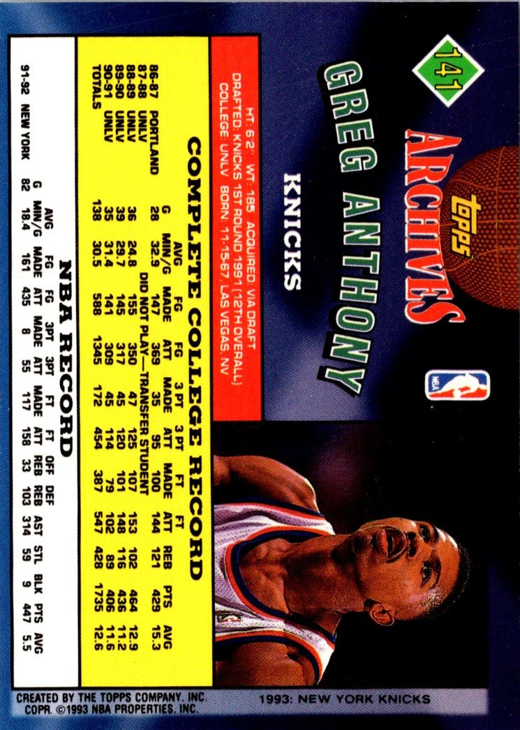 1992 Topps Archives Greg Anthony #141 New York Knicks card is a must-have for basketball fans and card collectors everywhere. Featuring a full-color portrait of Anthony in his classic Knicks uniform, this card perfectly captures the intensity and passion of the iconic NBA point guard. The back of the card showcases Anthony's stats from the 1991-92 season, including his impressive scoring and assist averages. This card is a great way to honor the legacy of one of the game's all-time greats. Add the 1992 Topps Archives Greg Anthony #141 New York Knicks card to your collection today!