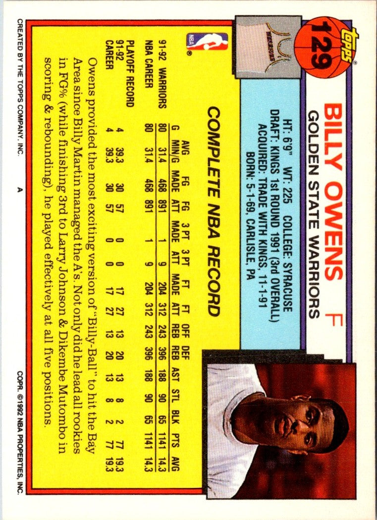Description: 1992 Topps Gold Billy Owens #129