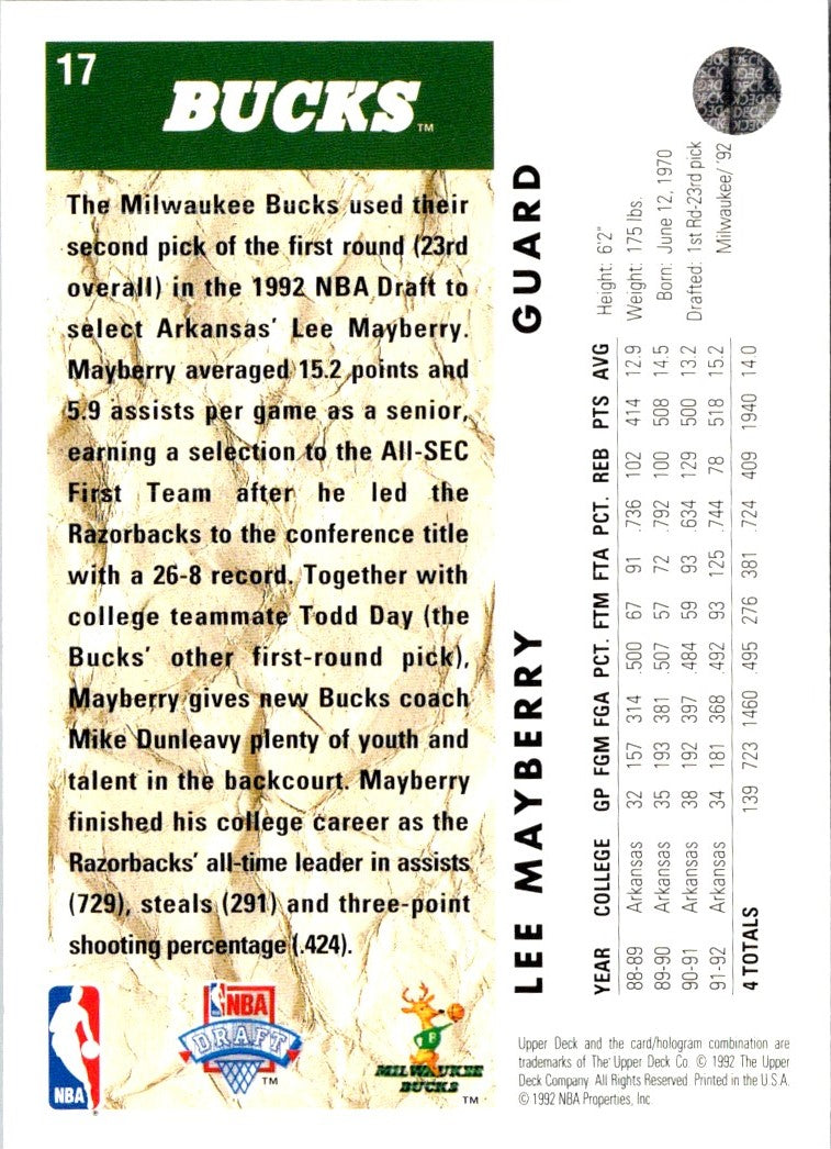 Description: 1992 Upper Deck Lee Mayberry #17 Rookie