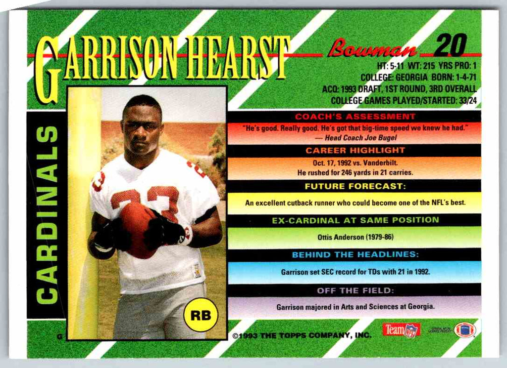 This 1993 Bowman Football card of Garrison Hearst #20 is an iconic piece of sports memorabilia. Hearst was a running back for the San Francisco 49ers and Arizona Cardinals over the course of his 12-year NFL career. He was a 3-time Pro Bowler and the 1996 Comeback Player of the Year. This card features Hearst in his 49ers uniform and showcases his signature running style. This card is a must-have for any serious football card collector. Add this piece of sports history to your collection today!