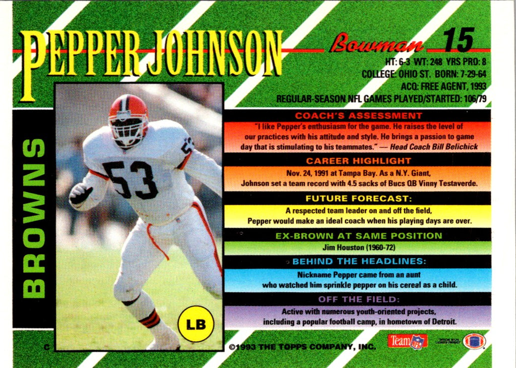 This 1993 Bowman Pepper Johnson #15 card for the Cleveland Browns is a great addition to your collection! This card features a full color action shot of Johnson in his Browns uniform and a glossy finish that brings out the vibrant colors. The back of the card features a brief bio of Johnson with his stats and accomplishments. This card is an absolute must-have for any Browns fan! Add it to your collection today!
