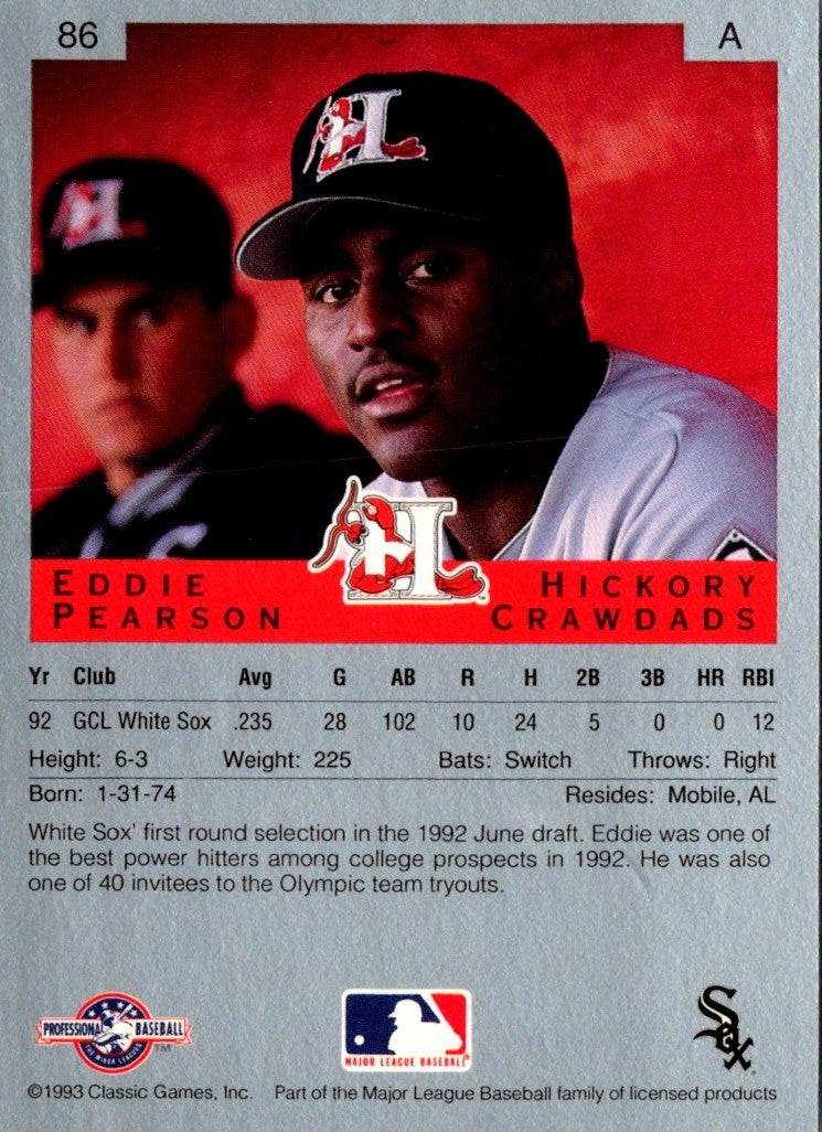 This 1993 Classic Best Eddie Pearson #86 Hickory Crawdads card is a must-have for any baseball enthusiast. Featuring a vibrant and detailed photograph of the popular baseball player, this card is sure to be a hit with any collector. The card is in near-mint condition, with sharp corners and no fading. The card back also features a detailed biography of Eddie Pearson and a history of the Hickory Crawdads team. Add this unique piece to your collection today and show off your passion for baseball!