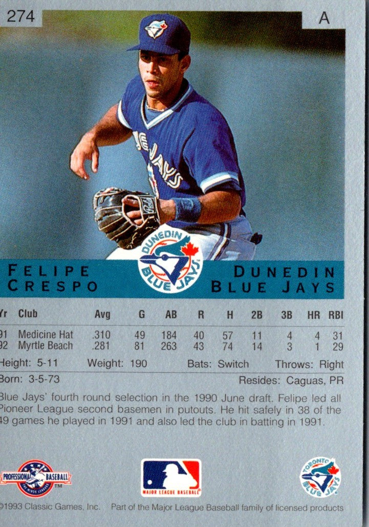 The 1993 Classic Best Felipe Crespo #274 Dunedin Blue Jays card is a must-have for any baseball collector. This card features a color headshot of Crespo in his Dunedin Blue Jays uniform, along with his career stats printed on the back. The card is in near-mint condition, with vibrant colors and sharp corners, making it a great addition to any collection. The card is a great way to commemorate Crespo's career with the Dunedin Blue Jays, and is sure to be a cherished item for many years to come.