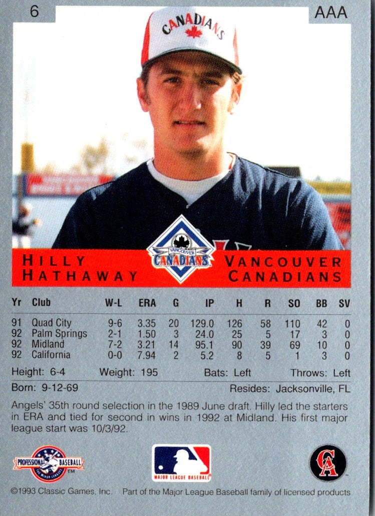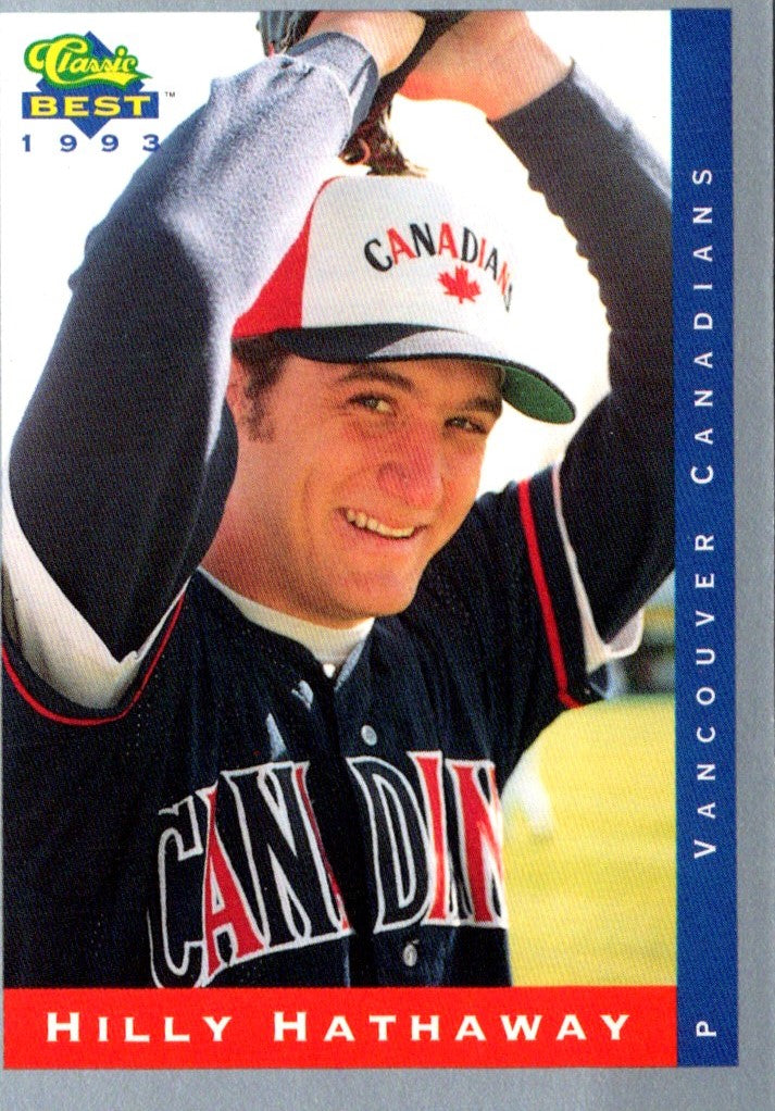 This 1993 Classic Best Hilly Hathaway #6Vancouver Canadians card is a must-have for any collector or fan of the Vancouver Canadians! This card features a color photo of Hilly Hathaway, with a classic design sure to stand out in any collection. The card is in mint condition and comes with a protective sleeve to ensure its condition. Whether you are looking to add to your collection or make a great gift, this card is perfect!