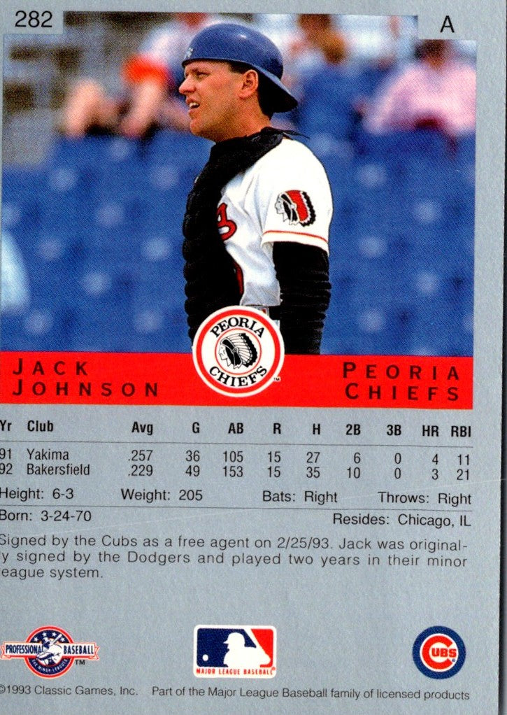 This 1993 Classic Best Jack Johnson #282 Peoria Chiefs is a must-have for any collector or fan. Featuring bold colors and graphics, this card is sure to stand out in any collection. Featuring Jack Johnson in his prime, this card captures the moment in a vibrant and detailed way. A great addition to any collection, this card is perfect for any fan or collector. Get your hands on this classic piece of sports memorabilia today!