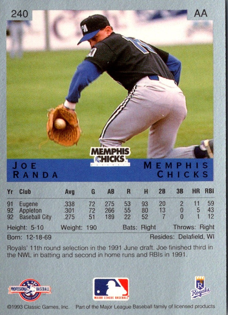 This 1993 Classic Best Joe Randa #240 Memphis Chicks card is a must-have for any baseball fan or card collector. Featuring a full-color glossy image of Joe Randa in his Memphis Chicks uniform, this card is sure to be a standout in any collection. The back of the card includes Joe Randa's stats as well as a brief biography, making it a great way to learn more about the player. Add this unique piece of baseball history to your collection today!