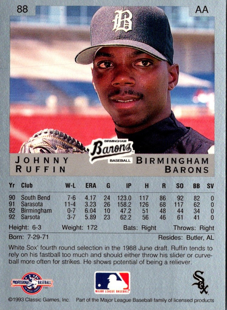 This 1993 Classic Best Johnny Ruffin #88 Birmingham Barons card is a must-have for any serious baseball card collector. Featuring a full-color portrait of the former Major League pitcher, this card is the perfect way to commemorate his career. With vibrant colors and sharp details, this card is sure to stand out in any collection. Not only is it a great addition to any collection, but it also serves as a reminder of the player's talent and hard work. Get your hands on this classic card today and add a piece of baseball history to your collection!