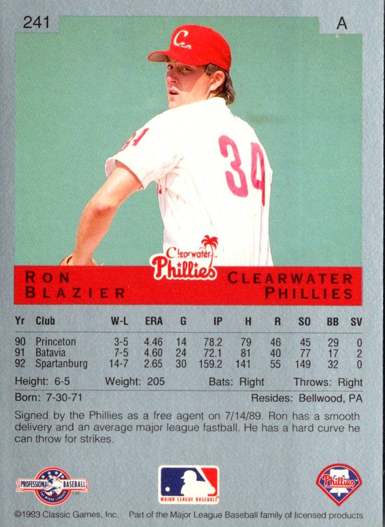 This 1993 Classic Best Ron Blazier #241Clearwater Phillies card is a must-have for any Phillies fan! Featuring a classic image of Blazier in his Phillies uniform, this card is sure to be a great addition to your collection. The card is in great condition and features excellent detail and sharp colors. You won't want to miss out on this amazing piece of Phillies history!