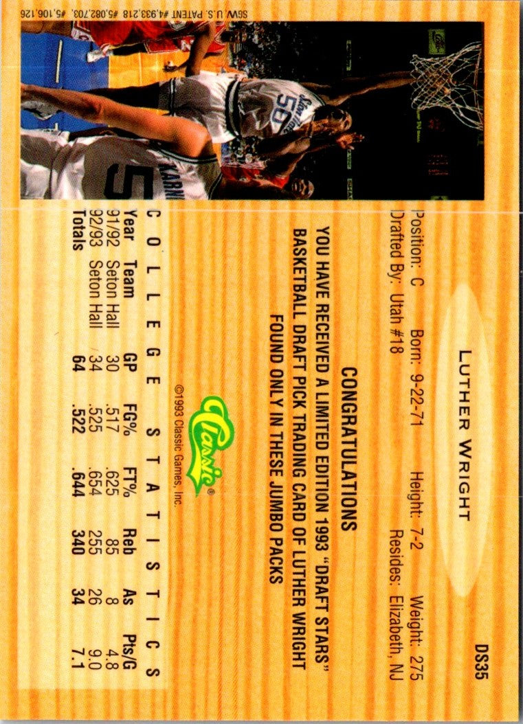 This 1993 Classic Draft Picks Luther Wright #DS35 Chromium Stars card is a must-have for any basketball fan! Featuring Luther Wright, a first-round pick from Seton Hall Pirates who went on to play for the Utah Jazz, this card shows off his incredible skills in a unique chromium star design. With vibrant colors and a glossy finish, this card is an eye-catching addition to any collection. It's the perfect way to show your loyalty to a favorite player, or to commemorate a significant moment in basketball history. Add this timeless card to your collection today!