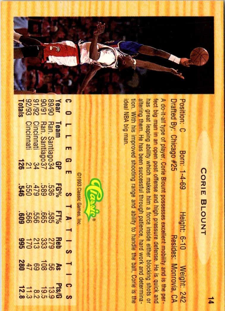 This 1993 Classic Draft Picks Corie Blount card #14 is a must-have for any Cincinnati Bearcats or Chicago Bulls fan. Featuring a bold and vibrant image of Corie Blount in his Bearcats or Bulls uniform, this card celebrates Blount’s 1993 NBA draft selection. With its glossy finish and sturdy construction, this card is sure to stand the test of time. Make it a part of your collection today and commemorate the start of Corie Blount’s professional career!