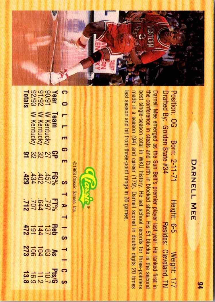 This 1993 Classic Draft Picks Darnell Mee card is a must-have item for any basketball enthusiast. It features a crisp and clear image of Mee in his Western Kentucky Hilltoppers uniform. This card makes an excellent gift for any die-hard Warriors fan, as it commemorates the career of this notable Golden State Warriors player. Celebrate Mee's career and add this card to your collection today!
