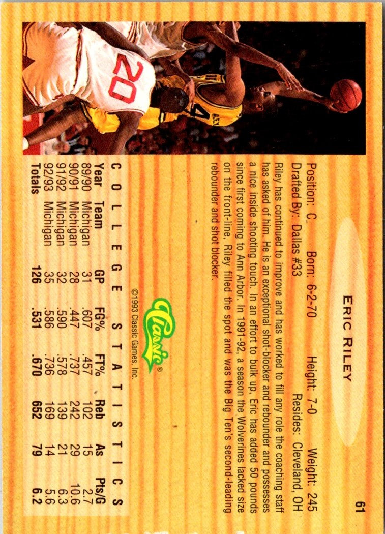 This 1993 Classic Draft Picks Eric Riley card #61 from the Dallas Mavericks is the perfect addition to any basketball card collection. Show your loyalty to the Mavericks with this in-demand card featuring a photo of Eric Riley in his Mavericks uniform. With excellent sharpness and color, this card is sure to be a great conversation piece. Add to your collection today before it's gone!