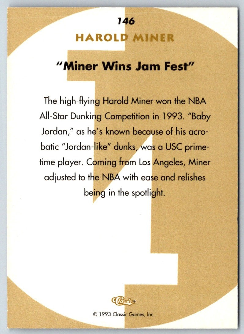 This 1993 Classic Draft Picks card of NBA star Harold Miner is a must-have for any sports fan! Miner was a powerhouse player for both the USC Trojans and the Miami Heat and an integral part of the 1993 draft class. This card is an excellent piece of memorabilia to commemorate and honor his impressive collegiate and professional career. With bold colors and sharp images, this card is a unique and timeless collector's item that any fan would be proud to own. Get your hands on this iconic card today!
