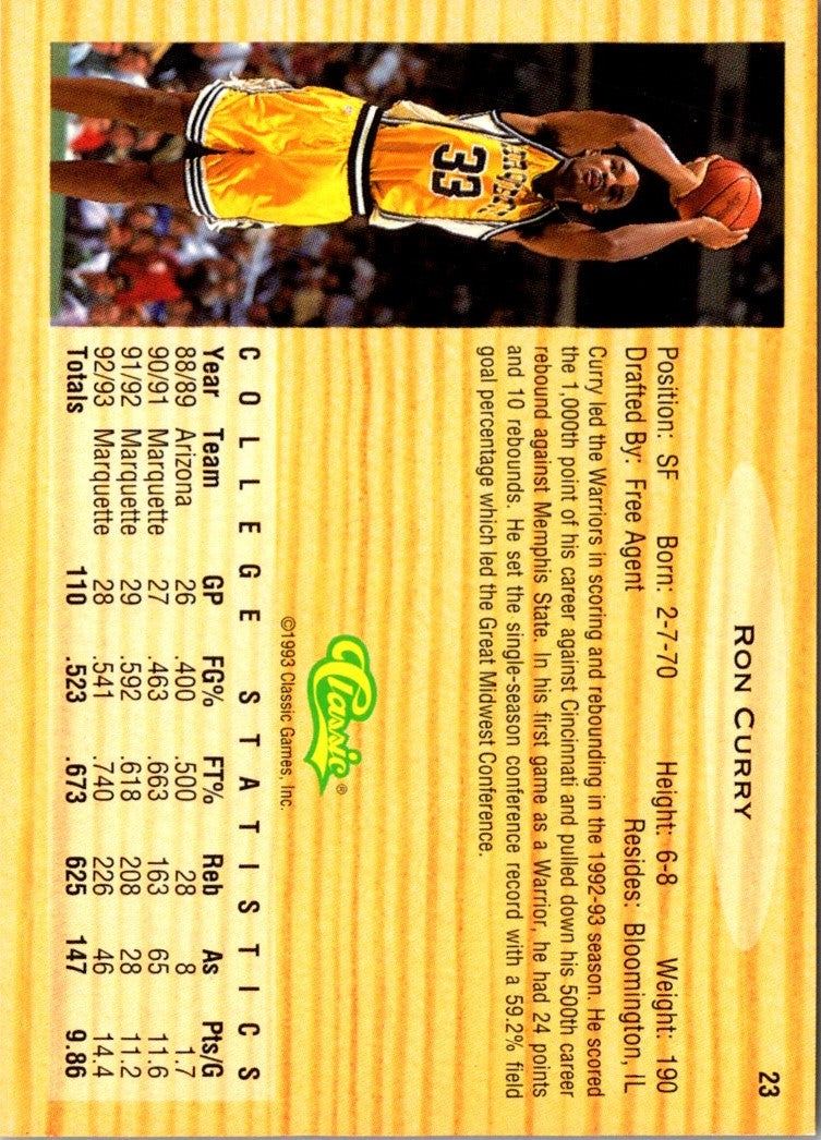 This 1993 Classic Draft Picks Ron Curry #23 Marquette Golden Eagles card is a must-have for any Marquette fan or basketball card collector. Featuring an action shot of Curry in his Marquette uniform, this card captures the energy of the Golden Eagles' 1993 season. With its crisp design, this card is a great way to celebrate the legacy of one of Marquette's most beloved players. Add this timeless piece to your collection today and relive the greatness of Ron Curry!