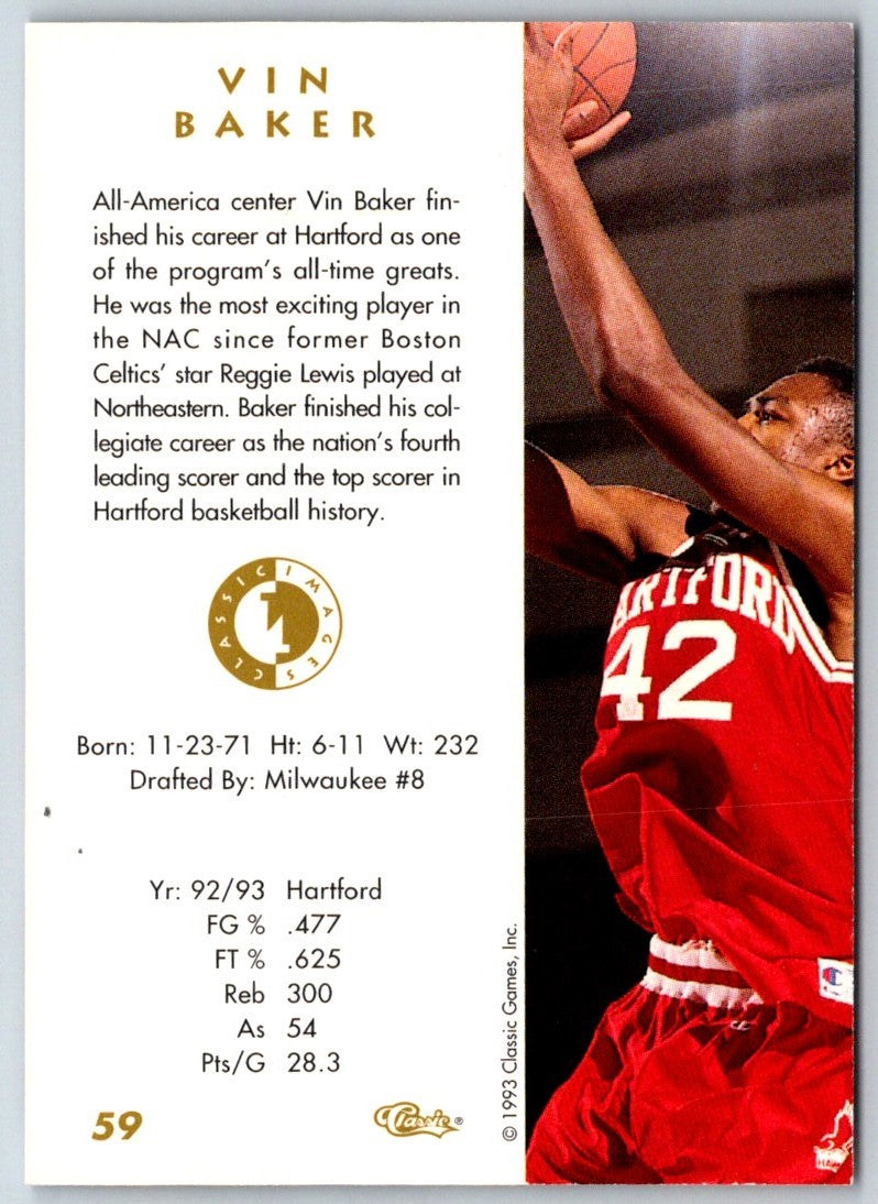 This 1993 Classic Vin Baker #59 is a must-have collectible basketball card for any fan of the game! Featuring a full-color image of Baker in his Seattle SuperSonics uniform, this card is perfect for any wall of fame or memorabilia collection. With a glossy finish and sharp details, you can bring the court to your collection. Add this iconic piece of NBA history to your collection and celebrate one of the most beloved players of all time!