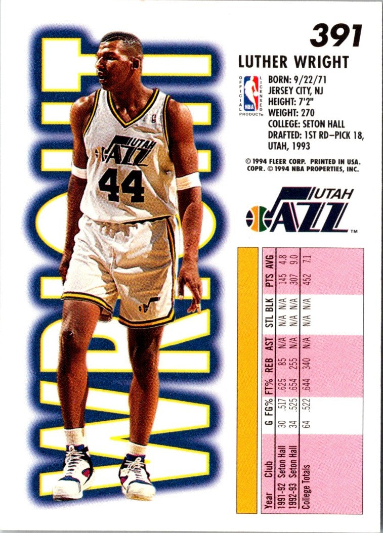 Description: 1993 Fleer Luther Wright #391 Rookie