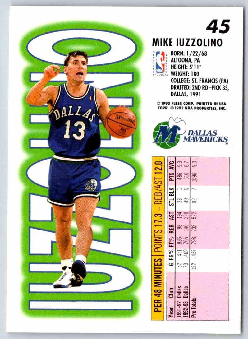 This 1993 Fleer Mike Iuzzolino #45 trading card is a must-have for any basketball fan. Featuring a headshot of Iuzzolino wearing his classic blue and yellow uniform, the card showcases the point guard's impressive career stats, along with a detailed biography on the back. A valuable piece of sports memorabilia, this card will make a perfect addition to any collection.
