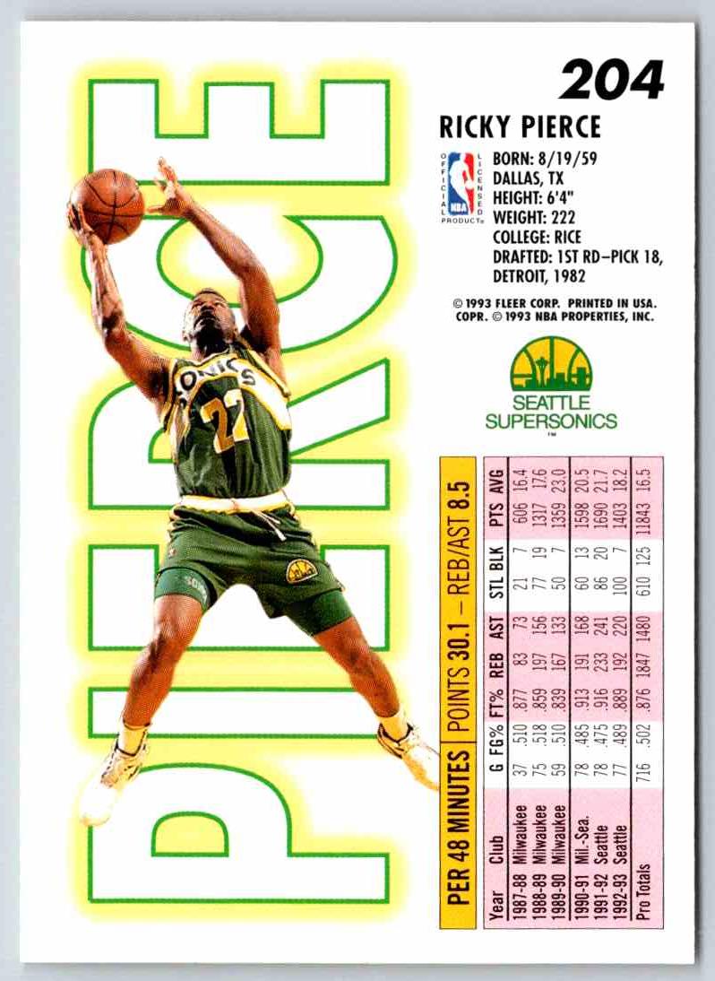 This 1993 Fleer Ricky Pierce #204 card is a must-have for any basketball enthusiast. Featuring a vibrant image of the player in mid-air, this card is sure to bring a classic element to any collection. With a career average of 16.4 points per game, Pierce was a force to be reckoned with on the court. This card is a great way to commemorate his impressive career. Add it to your collection today!