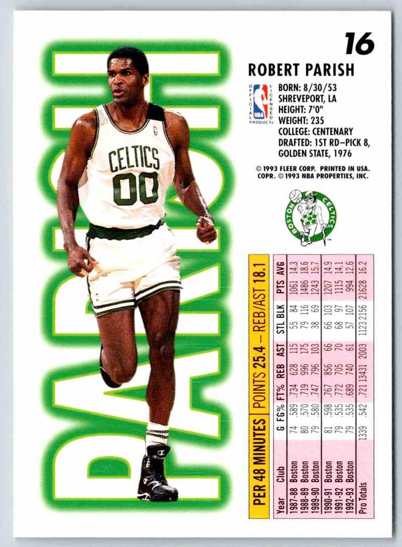 This 1993 Fleer Robert Parish #16 card is a must-have for any basketball fan! Featuring Robert Parish in his iconic Boston Celtics uniform, this card is a great way to commemorate one of the most decorated players of his generation. With excellent condition, this card is sure to make a great addition to any collection. Get your hands on this card and show your support for one of the most beloved players of all time!