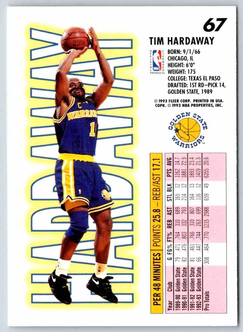 This 1993 Fleer Tim Hardaway #67 card is a must-have for any basketball fan or collector. The card features a full-color portrait of Hardaway in his Miami Heat jersey, and the back of the card includes a brief biography and a few stats from the 1992-1993 season. This card is a great way to show your support for a legendary player, and it would make an excellent addition to any collection.
