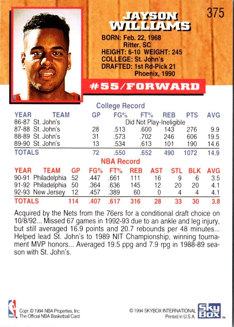 This 1993 Hoops Jayson Williams #375 card is a special piece of basketball memorabilia. Featuring the New Jersey Nets star on the front, this card is sure to be a great addition to any basketball fan's collection. The card's artwork captures Williams in mid action, and the bright colors really bring the card to life. This card is a great way to show your fan loyalty and is the perfect way to commemorate a moment in basketball history. Add this card to your collection today and get ready to relive the moment!