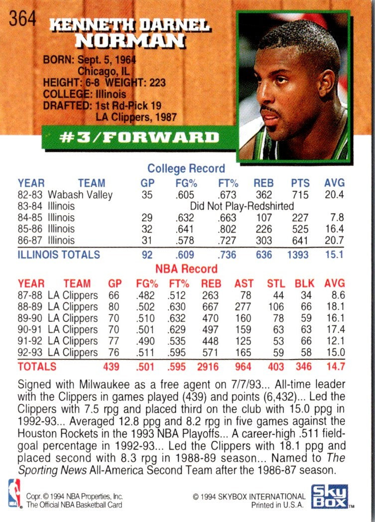 This 1993 Hoops Ken Norman #364 Milwaukee Bucks card is a must-have for any collector. A great addition to your collection, Norman was an 8-time NBA All-Star and was a key member of the Bucks during their 90s success. This card features Norman in his Bucks uniform, with a clean design and crisp photography. Add this card to your collection today and celebrate one of the Bucks' all-time greats!