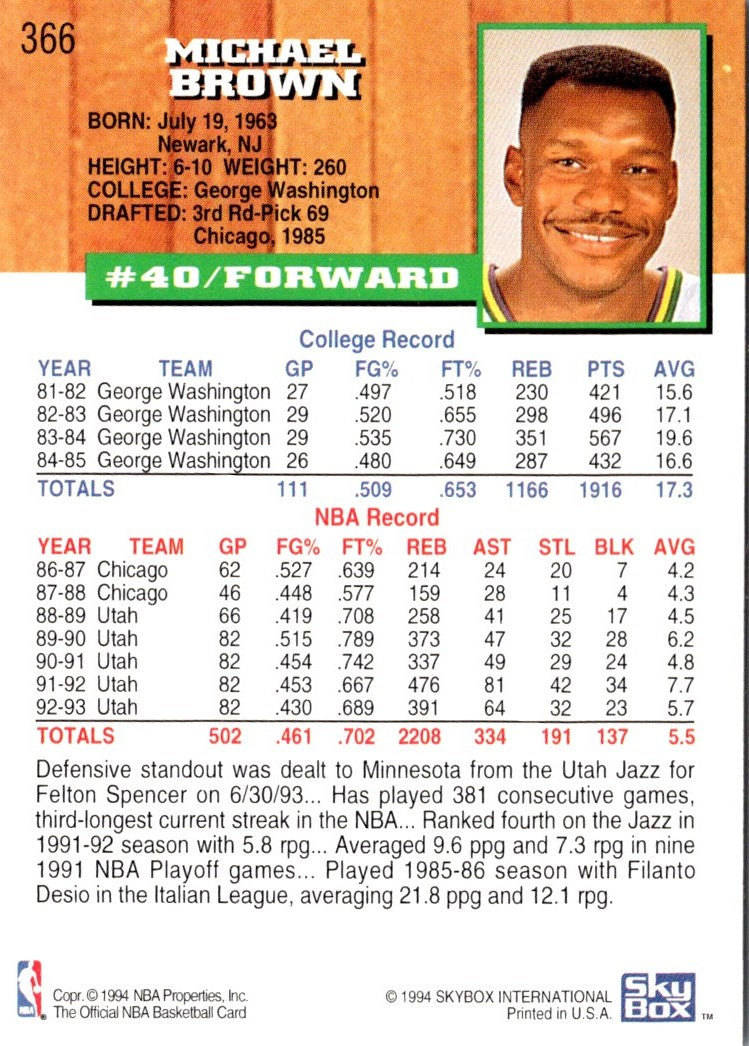 This 1993 Hoops Mike Brown #366 Minnesota Timberwolves card is the perfect addition to any basketball fan's collection. Featuring beautiful graphics, this card is sure to become a cherished part of your collection. Show your Timberwolves pride with this must-have item that is sure to be the centerpiece of any collection. Grab your copy today and add a unique touch to your card collection.