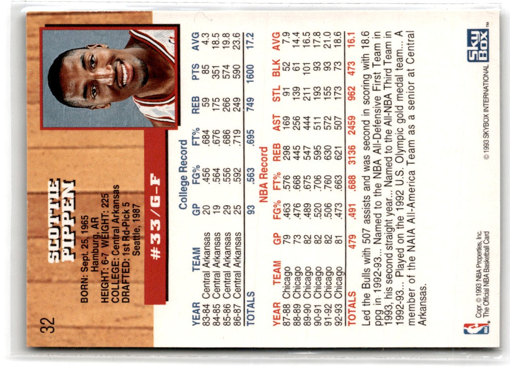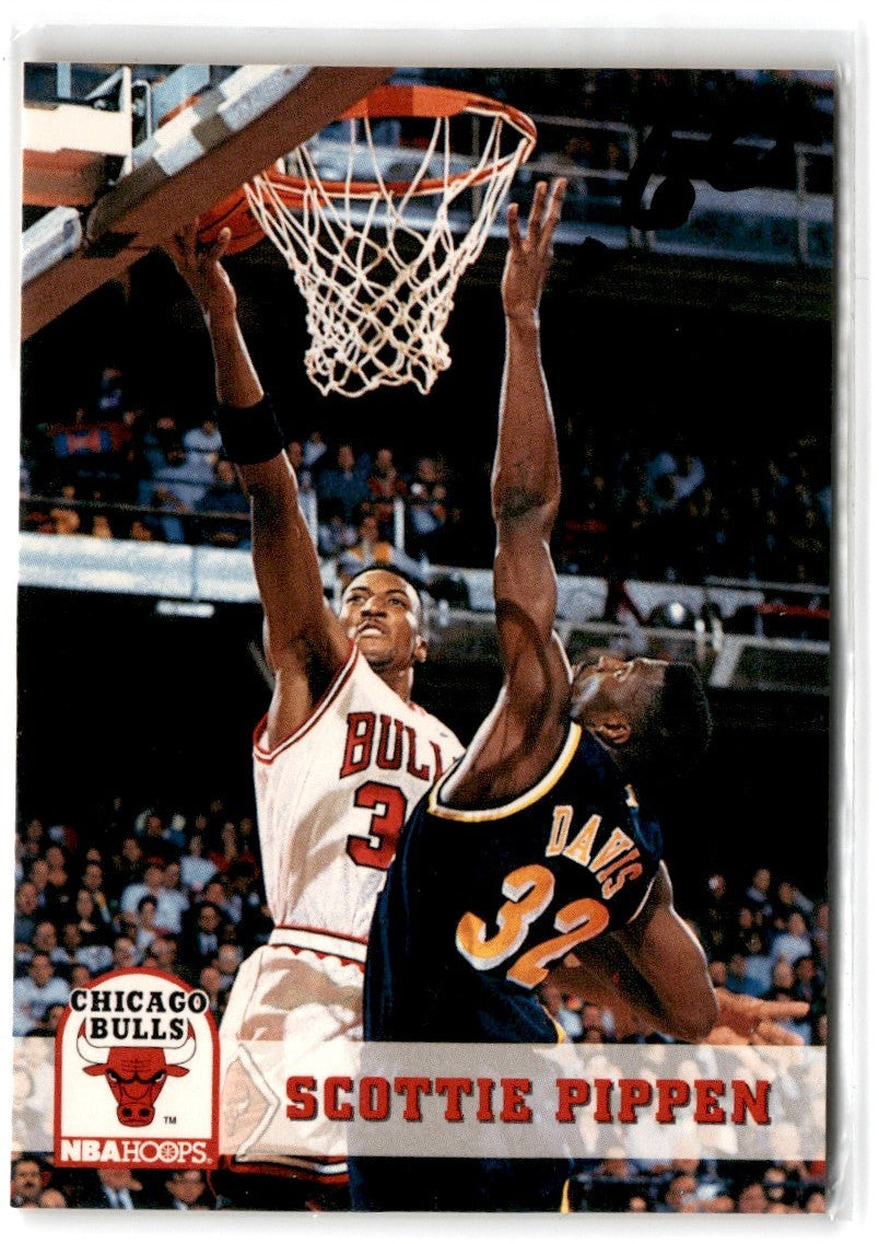 This 1993 Hoops Scottie Pippen #32 Chicago Bulls card is a must-have for any basketball fan. Showing the Hall of Fame guard in all of his glory, this card features a classic Bulls logo and a glossy finish. The vibrant colors and fine detail make this card an eye-catching addition to any collection. Whether you are a fan of the Bulls or of Scottie Pippen himself, this card is sure to be a hit in any collection.