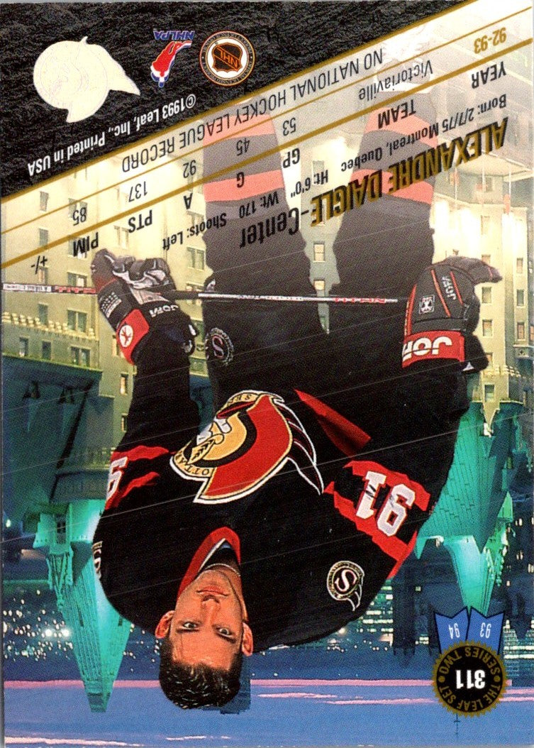 This 1993 Leaf Alexandre Daigle card is a must-have item for any hockey fan! Featuring a sharp, full-color image of Daigle in his Ottawa Senators jersey, this card captures a timeless moment in the career of one of hockey's most iconic players. This card is a great way to honor Daigle's legacy and show your support for the Senators. With its high-quality construction and vibrant colors, this card is sure to become a prized possession in any hockey fan's collection. Get your hands on this card today and make it a part of your personal sports memorabilia collection!