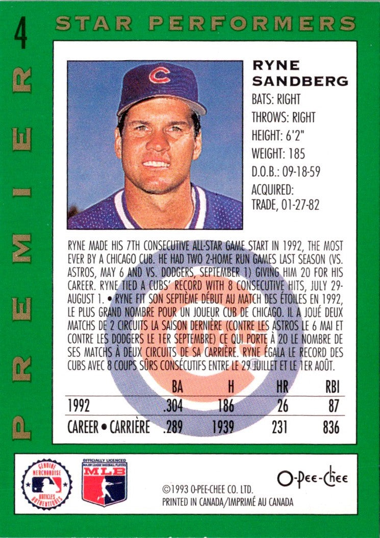 Description: 1993 O-Pee-Chee Premier Star Performers Ryne Sandberg #4