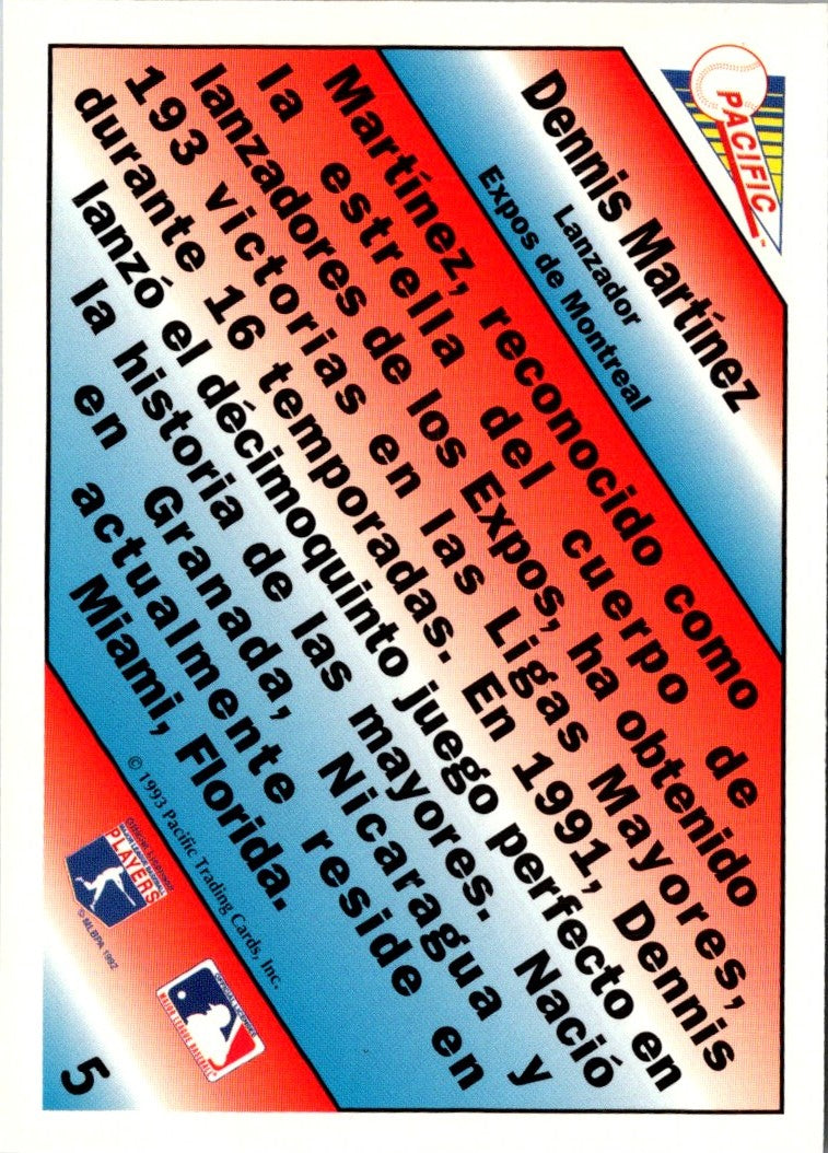 Description: 1993 Pacific Spanish Gold Estrellas Dennis Martinez #5