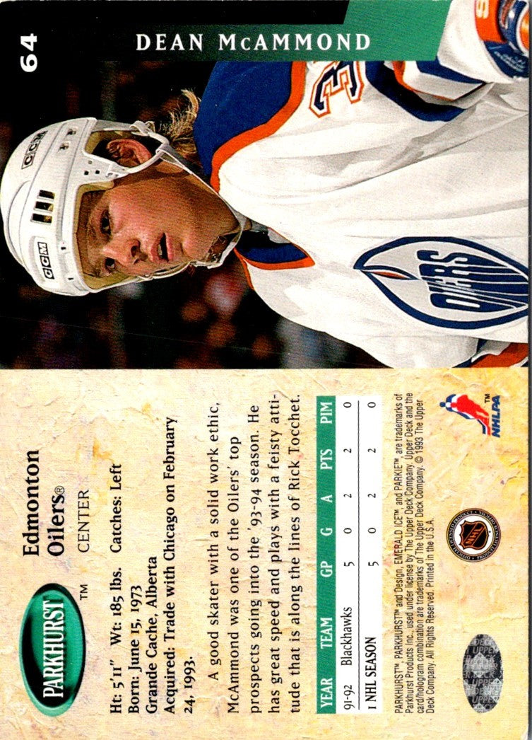 This 1993 Parkhurst Dean McAmmond #64 Edmonton Oilers card is a great collectible for any Oilers fan. The card features a headshot of Dean McAmmond in his Oilers jersey with the team logo and name printed at the bottom. The card is printed on glossy card stock and features a vibrant design that will look great in any collection. This is a must-have card for any Oilers fan or collector!